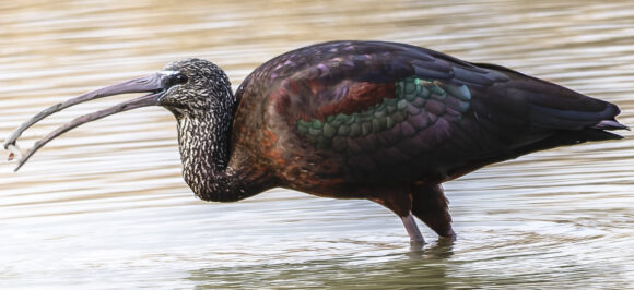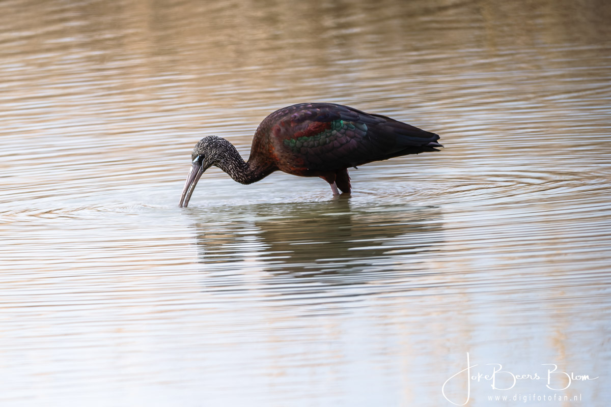 In het natuurpark bij Pont de Gau zaten ook een paar zwarte ibissen maar die naam klopt eigenlijk helemaal niet, als je goed kijkt heeft deze vogel werkelijk fabelachtig mooie kleuren. Zie hieronder een 100% weergave van een foto, klik erop om deze op volledig formaat te bekijken. De kleuren zijn waanzinnig mooi! Ley ook op de mooi gespikkelde hals en kop.