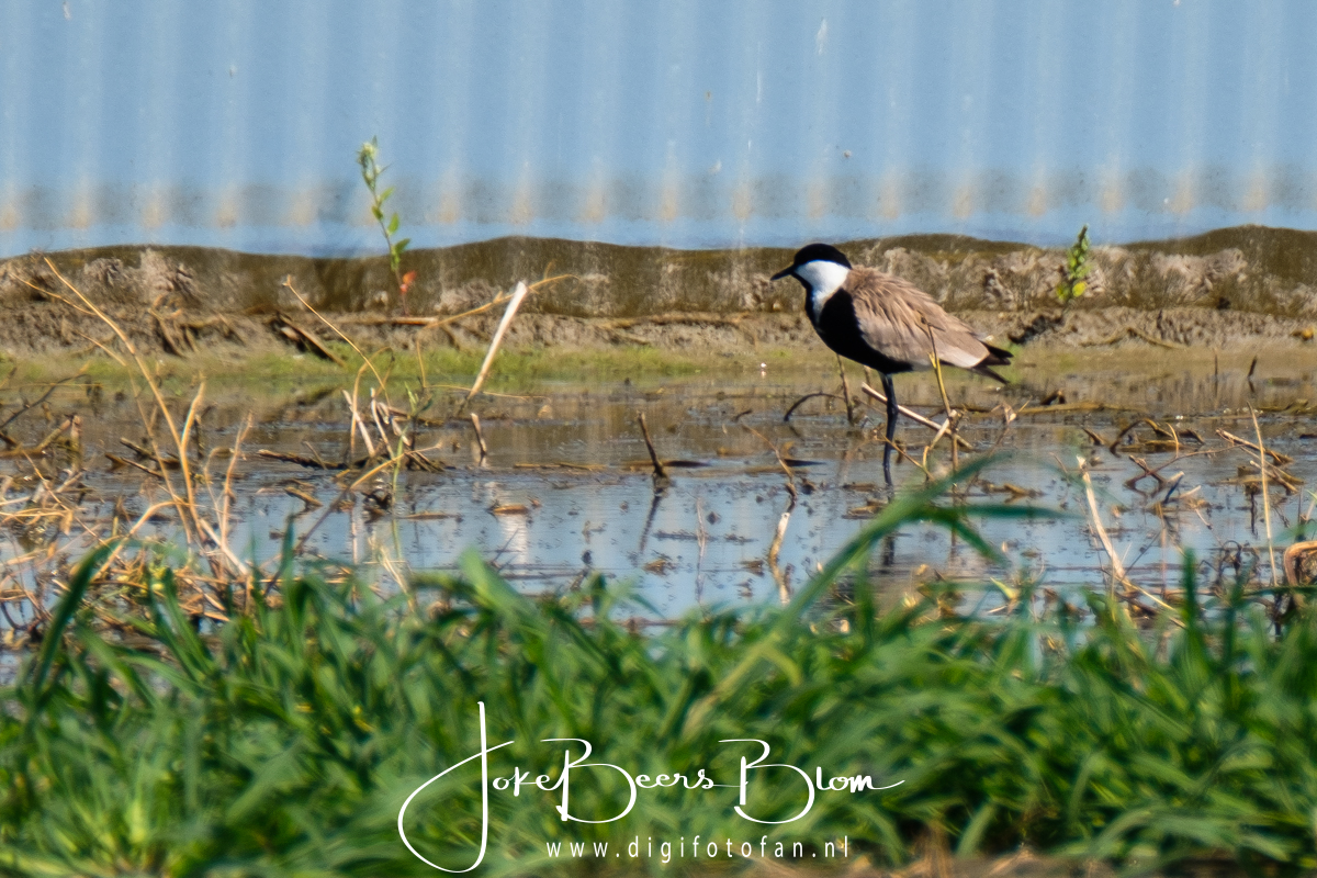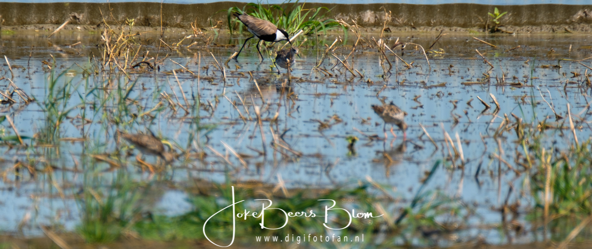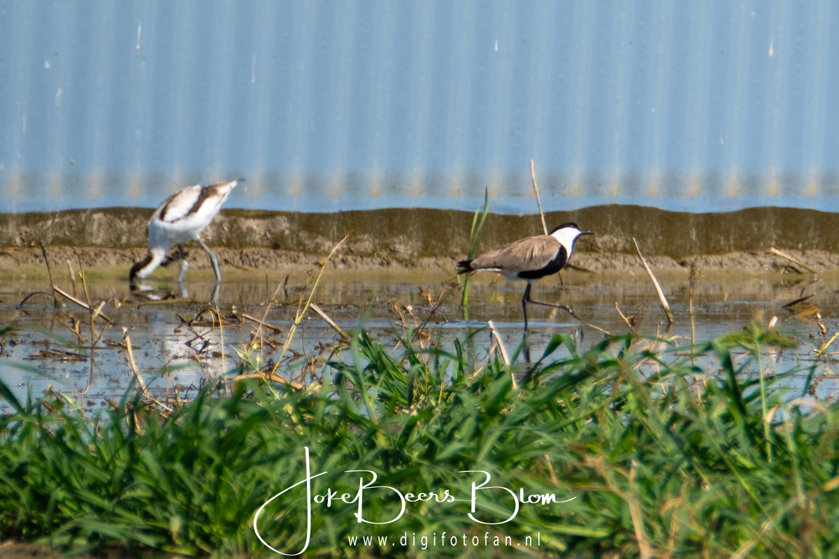 Op een stuk ondergelopen land in de Wieringermeer zitten heel veel vogels met daarbij een eenzame dwaalgast, de sporenkievit. Dit is een vrij zeldzame broedvogel uit het oosten van Europa. Hij komt vooral in Afrika en het Midden-Oosten voor. Het is een opvallende zwart-witte vogel meestal in open, wat droge gebieden te vinden. Droog is het hier nu dus wat dat betreft zit het dier wel goed!