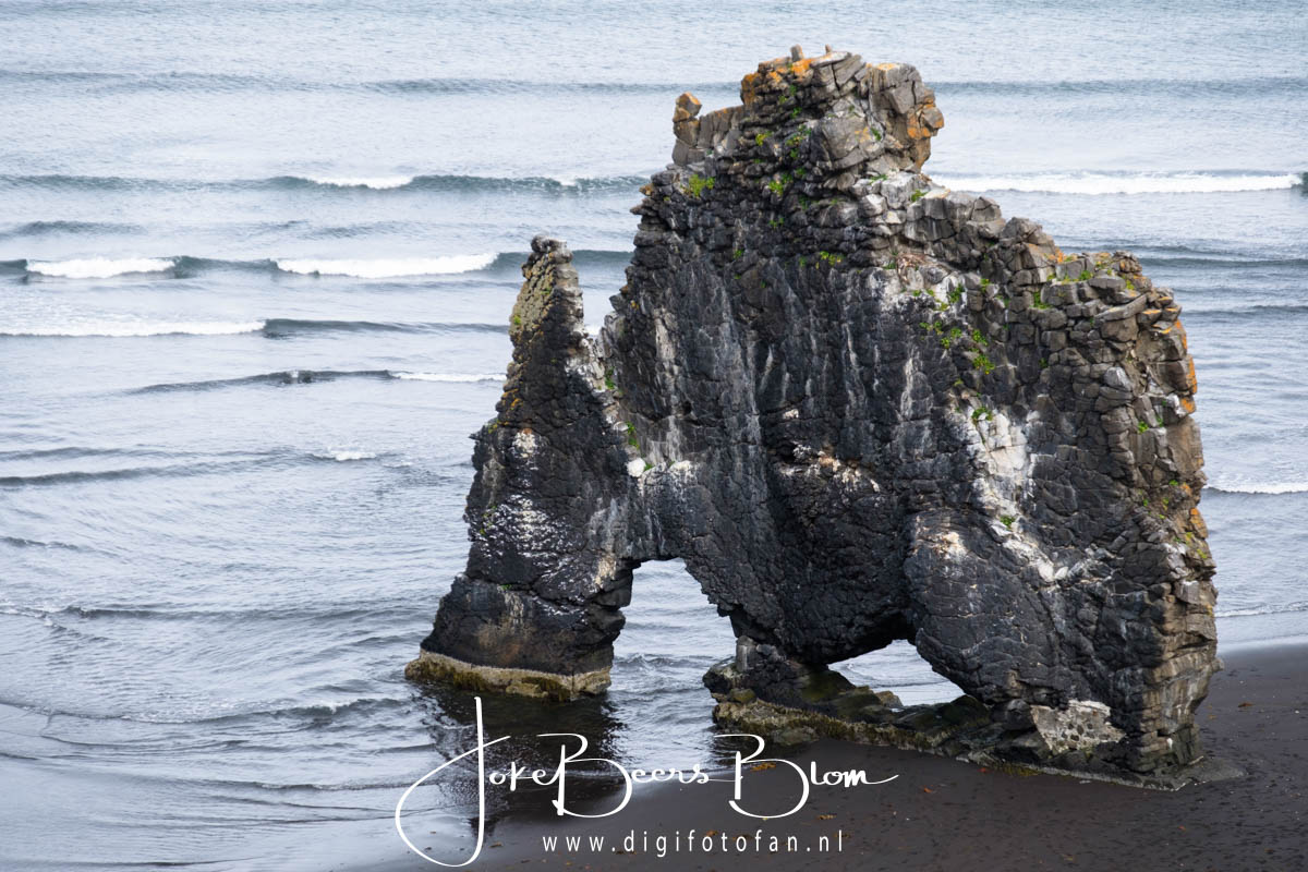 De volgende uitstulping hebben we niet rondom gereden, teveel slechte weg, daar schijnt vrijwel helemaal niemand te komen en dus hebben we dat maar niet gedaan, temeer omdat het die dagen ook wat regenachtig was waardoor het ook nog eens wat glibberig wordt. We zijn wel naar Glaumbær gereden en hebben daar het leuke museum en de turfhuisjes bezocht, het stadje Sauðárkrókur ligt daar dichtbij en daar zijn we via een fantastische route naar het westen en weer een stuk ringweg doorgestoken om vervolgens weer af te slaan naar Vatnsnes. Dit is echt een schiereiland en dat kun je rond rijden over een onverharde, niet al te beste weg maar omdat wij wel naar Hvítserkur wilden en van vorig jaar wisten dat het wel te doen was en nog eens ontzettend mooi is hebben we dat wel gedaan. Hvítserkur is een rots in zee op een mooie plek, je kunt naar beneden als het eb is maar het was nogal glibberig en mezelf kennende moet ik dat gewoon dus niet doen en bovendien vanaf de kust is het uitzicht er op ook fantastisch. En daar zagen iets verder dus ook ijsbergjes drijven, heel apart om te zien!