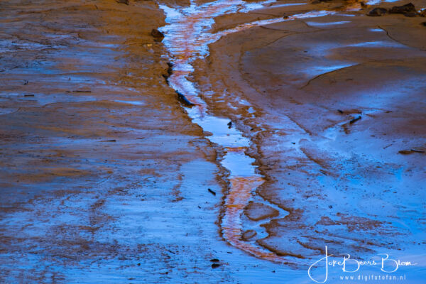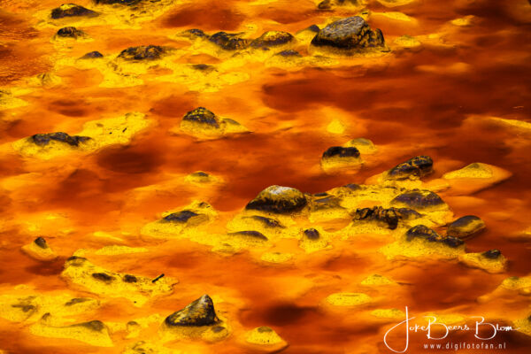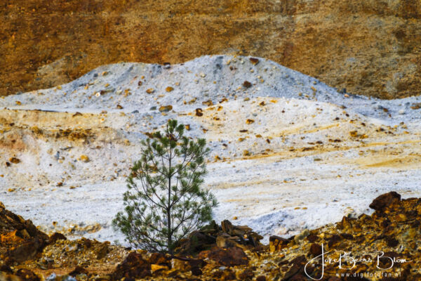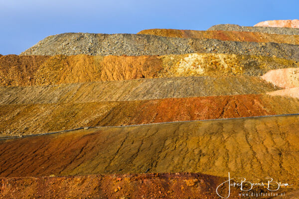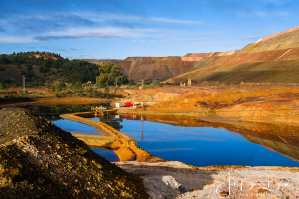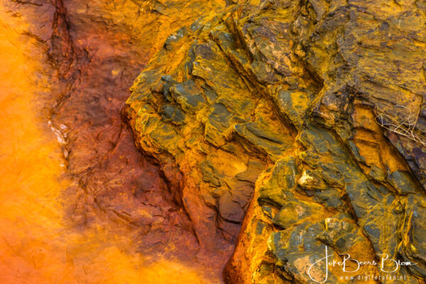 Vanaf de camperplek richting Portugal gegaan maar al vrij snel weer richt Spanje gegaan omdat Hans gillend gek werd van de verschrikkelijk slechte weg. Ik wist dat het niet best was in dat deel maar zo slecht was echt bizar, enorme kuilen, compleet kapot asfalt en dat is niet best voor de camper! En zo kwamen we weer in de buurt van de Rio Tinto en met name de mijnen. We zouden op de camperplek in het plaatsje Minas de Riotinto overnachten maar die lag naast een kruispunt van twee drukke wegen, niet echt leuk en we wisten van de camperplek bij Pena del Hierro, zie ook de link aan het begin van deze blogpost. Dus daar heen gegaan en weer heerlijk in het kleurrijke gebied waar de natuur het weer al meer overneemt gewandeld en gefotografeerd! De volgende morgen ook de nog zeer minimale Rio Tinto daar opgezocht, weinig water, wel prachtige kleuren. En het licht op de huidige mijnen was fantastisch dus daar ben ik op een plek uitgestapt om foto’s te maken, Hans is wat verderop met de camper gestopt, later ben ik uiteraard terug gelopen. Vervolgens kwamen we langs de mijnen zelf, de uitzichtplek was afgesloten, wel iets verder nog aan een meer waar ze water uit oppompen voor het verwerken van de opgegraven grond/gesteente. Hier zie je meest vreemde vormen en ook het water is bruinrood.