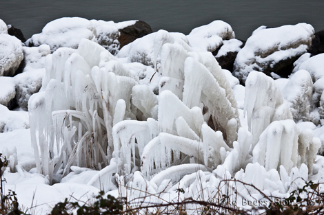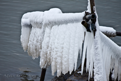 Langs de randen van het IJsselmeer lijkt het de Noordpool wel! Behoorlijk bevroren, alle keien hebben een ijsmuts op! Door de golfslag zijn prachtige vormen ontstaan in o.a. het riet. Ik had het gisteren al gezien maar had toen geen camera mee, dus nu camera met 100-400 erop meegenomen. Het is nl. vrij moeilijk momenteel om daar beneden te komen, de stenen zijn spekglad en dat risico neem ik dus maar niet.