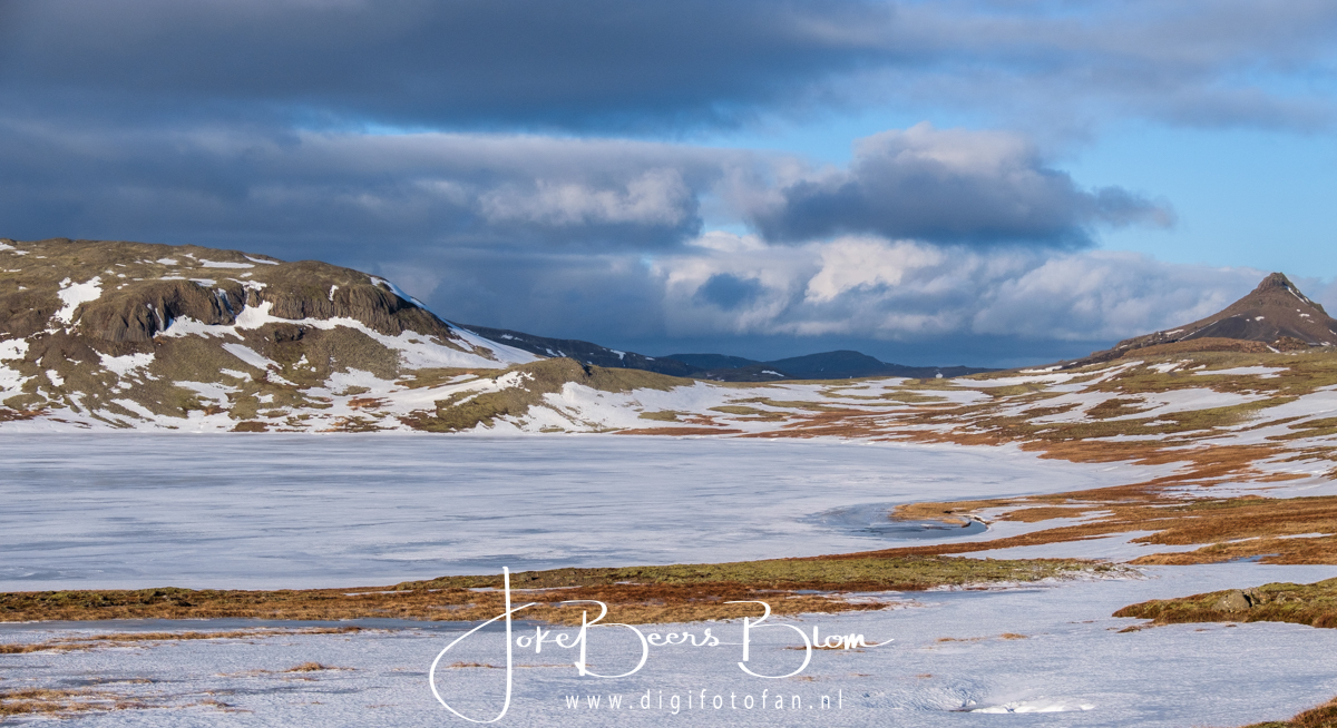 De meest gefotografeerde berg van IJsland, Kirkufell, ligt langs de noordkust en is heel herkenbaar, je ziet de berg al heel lang van tevoren maar dan herken je ‘m dus niet van al die foto’s. Jon wist dat ik mijn huiswerk wel gedaan had en vroeg pas toen we er waren of ik de berg herkende, ja dus maar we zaten er al een klein halfuur tegenaan te kijken want je ziet ‘m al vrij snel liggen maar van de zijkant herken je het dus niet want alle foto’s geven de andere kant weer. Dat wordt wel duidelijk als je de foto’s hieronder bekijkt. Achteraf waren we heel blij dat er al veel sneeuw en ijs weg was anders was ik bij Kirkufell dus niet boven de watervalletjes gekomen die deel uitmaken van het beroemde uitzicht op de berg. Een klein stukje van het pad was nog bevroren en erg glad maar onze galante gids hielp me naar boven anders had ik het ook niet gedaan. Sinds mijn enkelbreuk in Frankrijk ben ik extreem voorzichtig geworden op dergelijke plekken. Terug ging wel goed langs een ander deel van het pad over het touw heen want daar was het vrijwel niet glad. Kortom ik ben heel blij dat ik er wel gekomen ben want het was fantastisch!