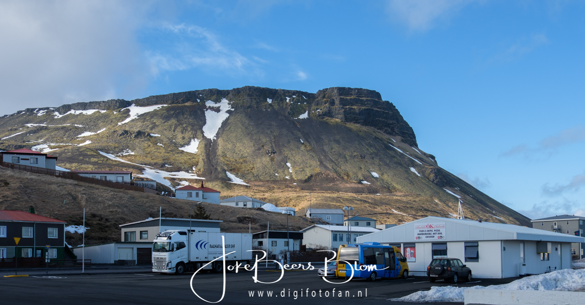 Daarna zijn we langs een stuk prachtige kust naar Olafsvik gereden, de bevroren rotswanden die vol met ijspegels hingen waren fantastisch! En ook heel mooi want omdat het wat gedooid had was het ijs weer helemaal helder zo mooi! In Olafsvik hebben we geluncht en ik moet zeggen dat ik nog zelden zo’n lekkere cheeseburger gehad heb met heerlijke gekruide patatjes erbij, zeer betaalbaar en erg lekker!