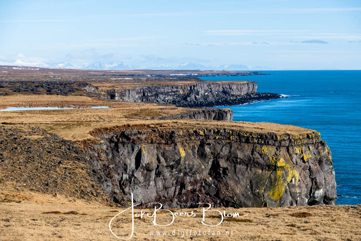 Wat betreft deze route had ik van tevoren al met Jon besproken dat ik heel graag naar Kirkufell, zie vorige blogpost, en de plaatsjes Hellnar en Arnarstapi wilde, voor de rest vonden was alles prima. Nou de goede man is op zoveel plekken gestopt en heeft ons zoveel laten zien en verteld, het was echt super! Langs de westkant zijn we eerst gestopt bij Dritvik-Djupalonssandur. Dit is een baai met een mooi zwart kiezelstrand aan de voet van de Snæfellsjökull (gletsjer). Je kunt er naar beneden maar dat was erg glad dus dat hebben we niet gedaan, het uitzicht op het strand en de lava was echter fantastisch. Je ziet ook nog de resten van een vistrawler die hier in 1948 vergaan is. Het was er fantastisch, vooral de kleuren zijn zo mooi, een aantal Amerikaanse dames wat minder ………
