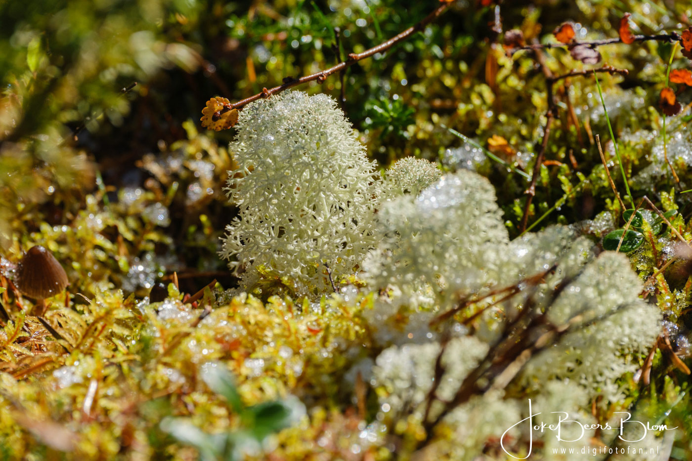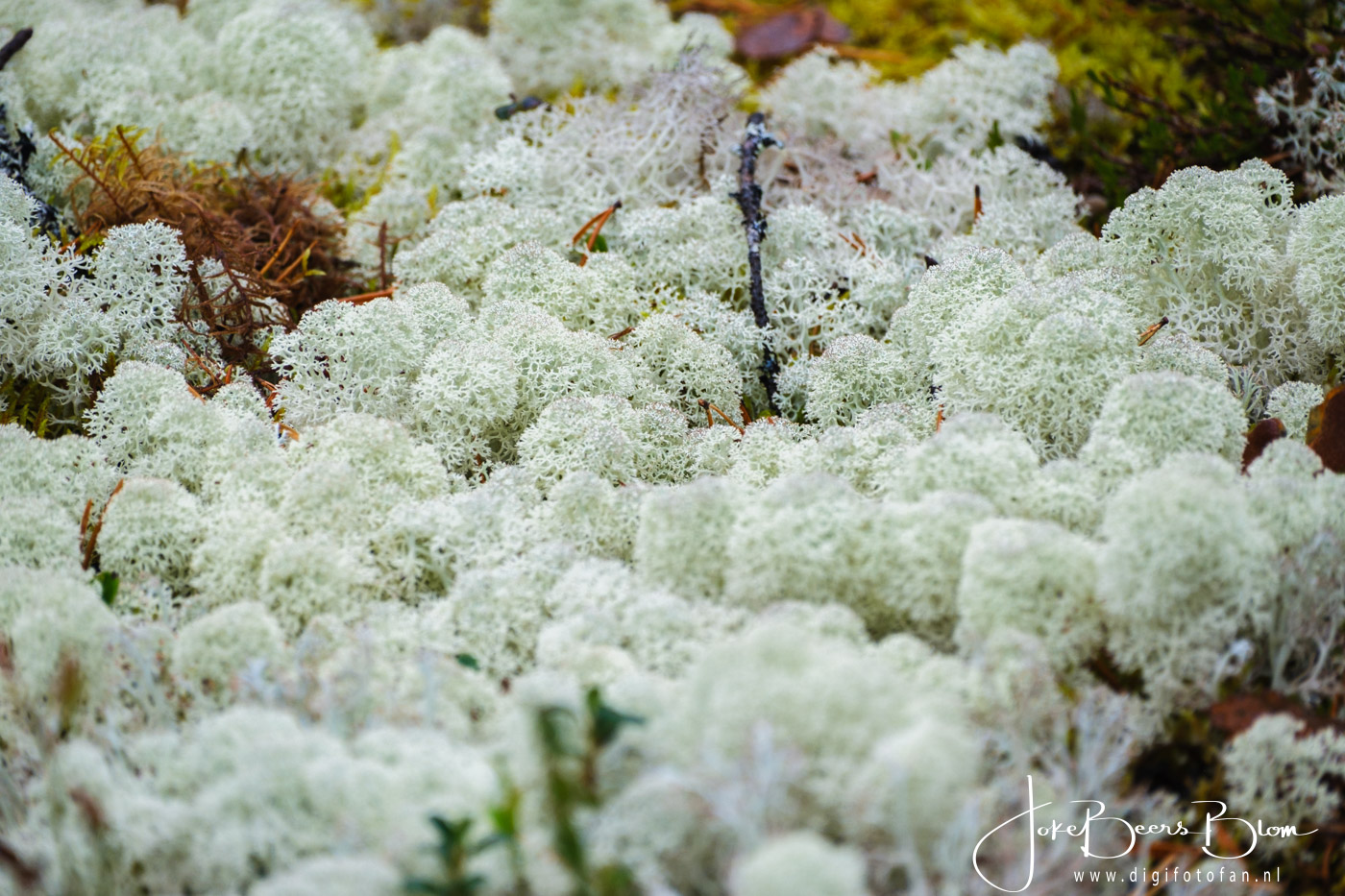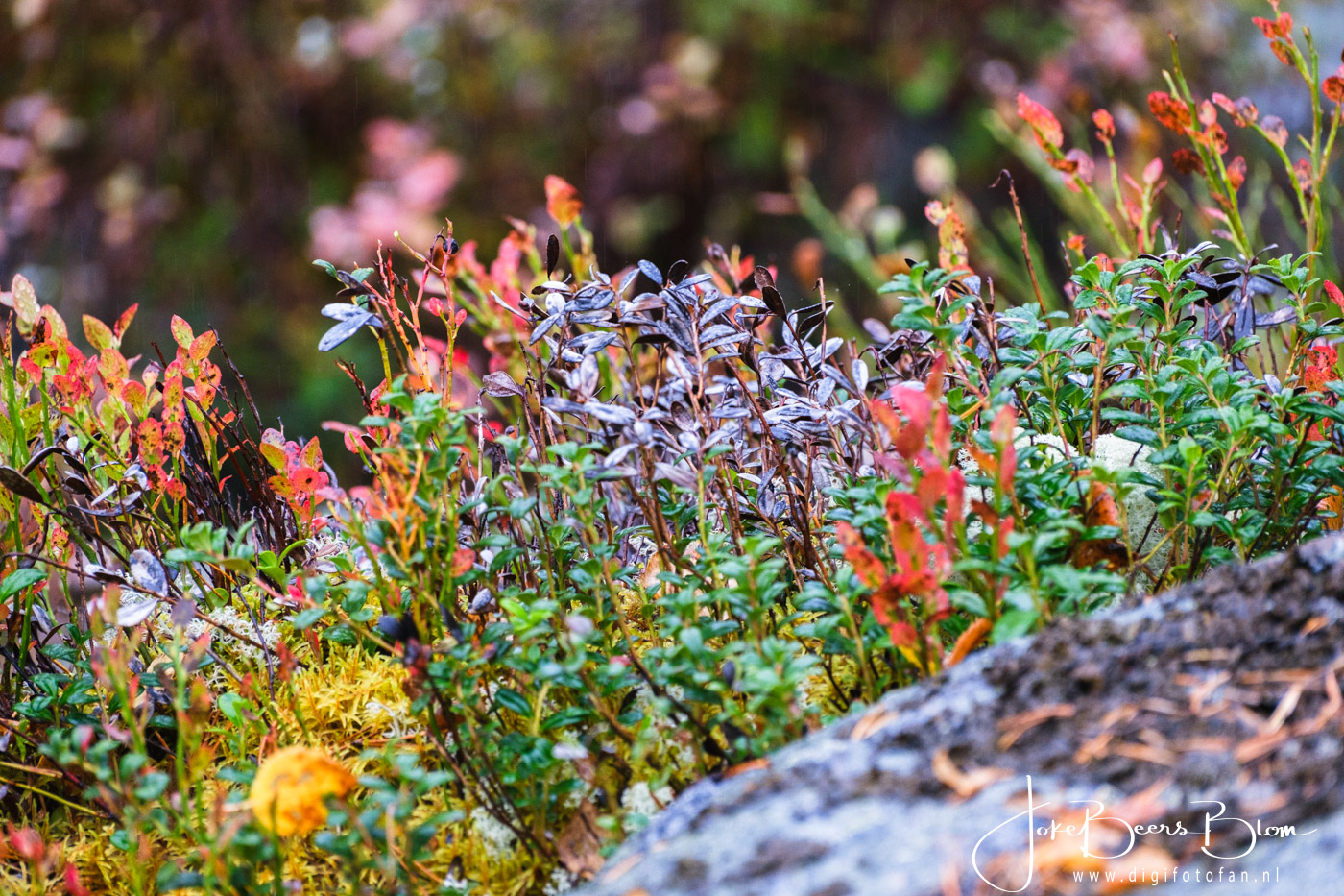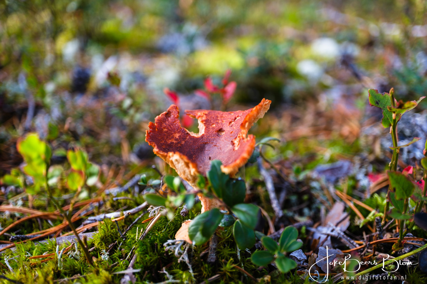 Ik geniet in de bossen van Scandinavië en ook op de toendra in het hoge noorden altijd zo van al die prachtige kleine plantjes die daar groeien. Vooral in de herfst is het fantastisch, zo kleurrijk en gevarieerd. Ook die hele kleine paddenstoeltjes vind ik altijd zo mooi en het maakt niet uit hoe vaak we er komen, ik maak er elke keer weer foto’s van! Dat doe ik doorgaans met de 70-300 mm telezoom en met de 30 mm macro waarmee ik heel dichtbij scherp kan stellen. Het hangt van de situatie af, de macro heb ik vaak gebruikt als de plantjes wat hoger stonden zoals bijvoorbeeld langs een pad dat de heuvel afgaat, de omringende bosgrond ligt vaak wat hoger. Door lichte artrose kan ik niet altijd meer zo laag bij de grond komen en dus doen we het op een andere manier, tja ook ik word ouder 😉 Maar dat houdt me niet tegen, dan doen we het gewoon op een andere manier. Op een gegeven moment stonden we op een prachtige plek aan een meer in het oosten van Noorwegen, het regende pijpenstelen maar het was zo onwijs mooi wat er tussen de bomen stond en tja in Noorwegen zeggen ze dat slecht weer niet bestaat, wel slechte kleding! En gelijk hebben ze! Ik ga dan wel lekker naar buiten en ach als ik nat wordt dan heb ik in de camper waar de dieselkachel lekker brandt wel weer wat droogs om aan te trekken 🙂 Maar juist dit vind ik zo geweldig aan Scandinavië, al die bossen, al die natuur, ik krijg daar nooit genoeg van! En volgend jaar? Dan hoop ik weer allemaal plantjes te fotograferen, wie weet ook in het voorjaar maar dat is nog ver weg, we leven nu en dan zien we wel weer!