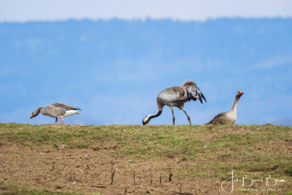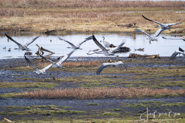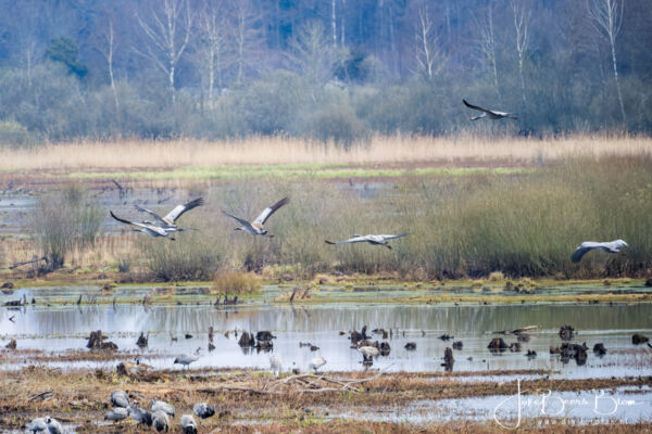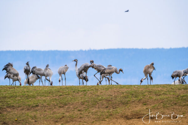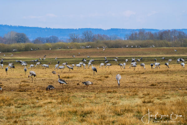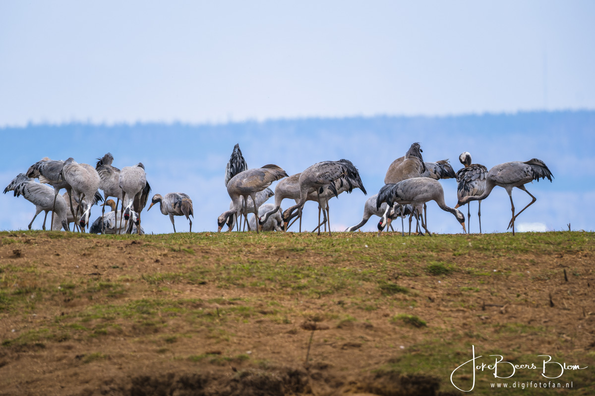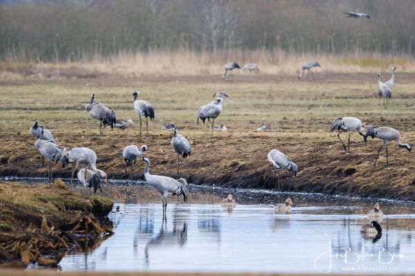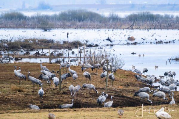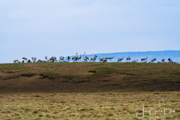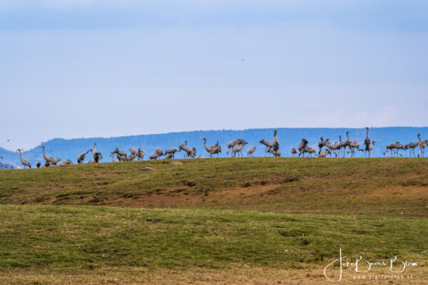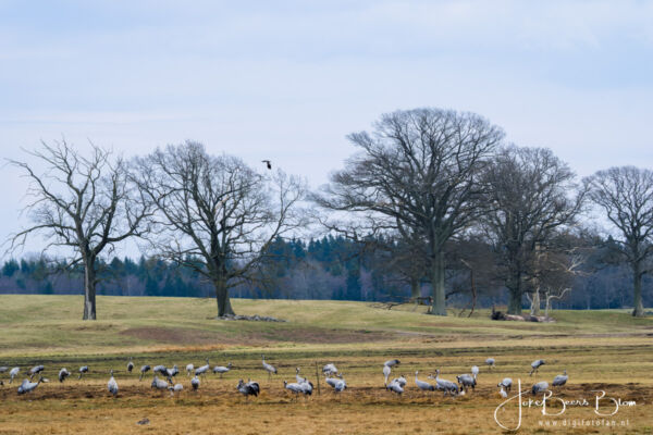 Hornbergasjön is een bekende foerageerplaats voor de kraanvogels op weg naar het hoge noorden, voor de hele grote aantallen moet je er rond eind maart/begin april zijn, dan kunnen er werkelijk duizenden zitten, het hoogste aantal geteld dit jaar was op 28 maart bijna 17.000 vogels! De laatste telling was 12 april met 2760 vogels. Wij waren er op gisteren 18 april en naar ons idee zaten er zeker nog meer dan 1000 tot 1500 maar het was vanmorgen, de 19e dus, vrij rustig maar dat kan ook door het weer komen. Toch zaten er nog wel een heel aantal.