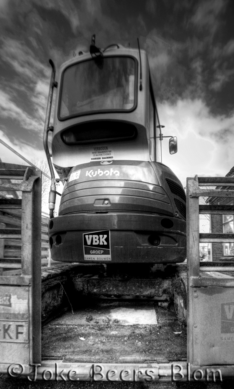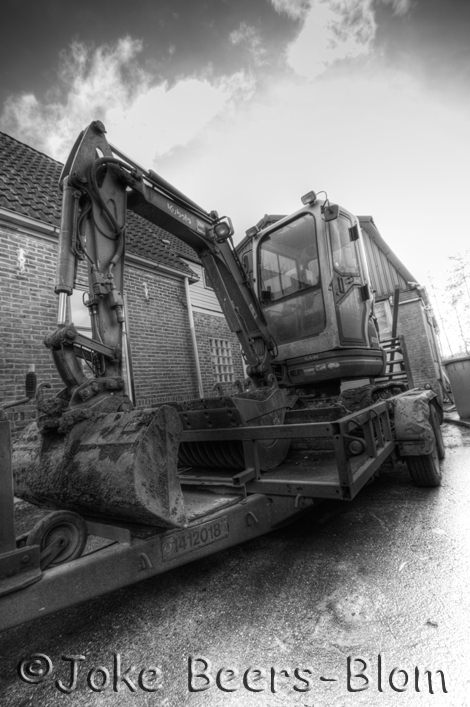 Vanmorgen wat foto’s gemaakt van het speeltje van mijn echtgenoot (nou ja van de baas eigenlijk). Bewust met de groothoeklens gedaan op 10mm zodat het min of meer een monster zou worden. Het was de bedoeling er HDR’s van te maken, is ook wel gebeurd maar van de meesten was de kleur in de lucht nogal heftig roze, teveel tegenlicht. Dus er een tijdje mee zitten spelen en ze omgezet naar zwartwit in Photoshop, enkelen via de kanaalmixer en enkelen via de opdracht zwartwit. Het uiteindelijke resultaat vond ik toch wel apart, bijna tekeningen waarbij ik ook nog eens lekker wat contrast heb meegegeven.