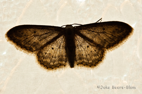 Dit motvlindertje zat op de achterdeur en bleef daar lang zitten dus toch maar even de macrolens op de camera gezet! Het beestje was niet breder dan anderhalve centimeter.