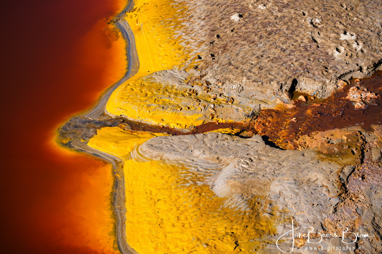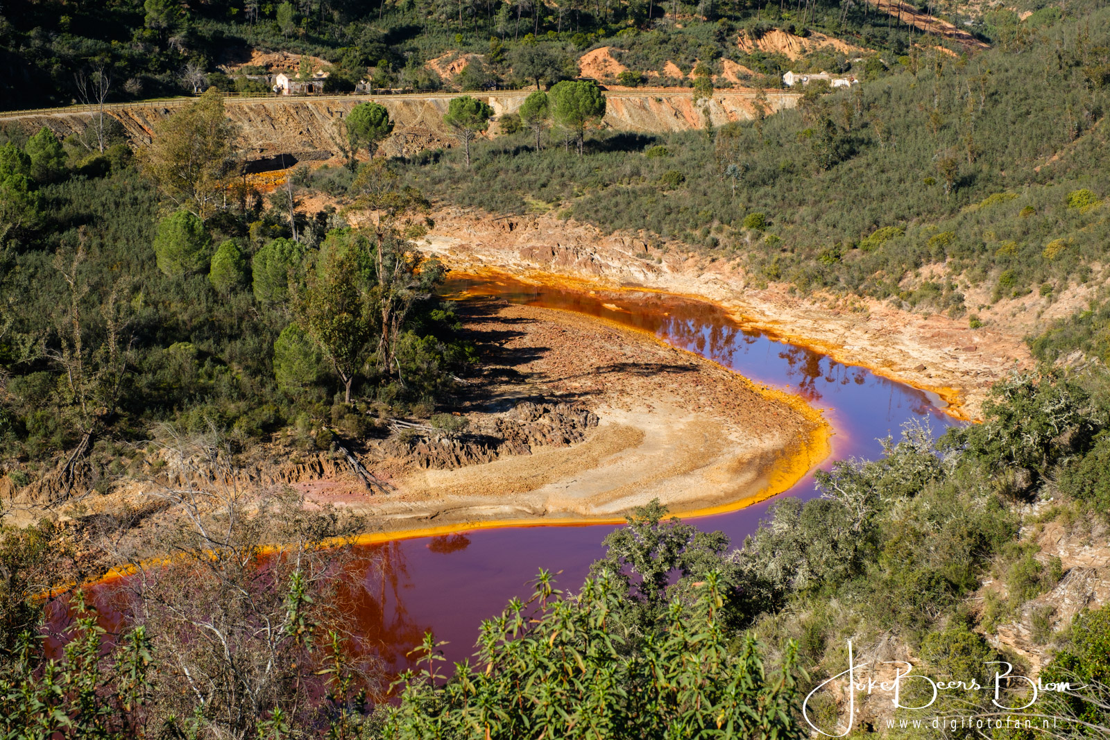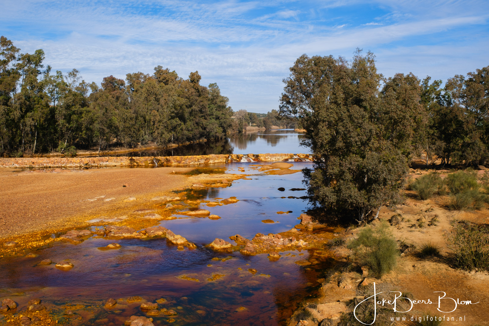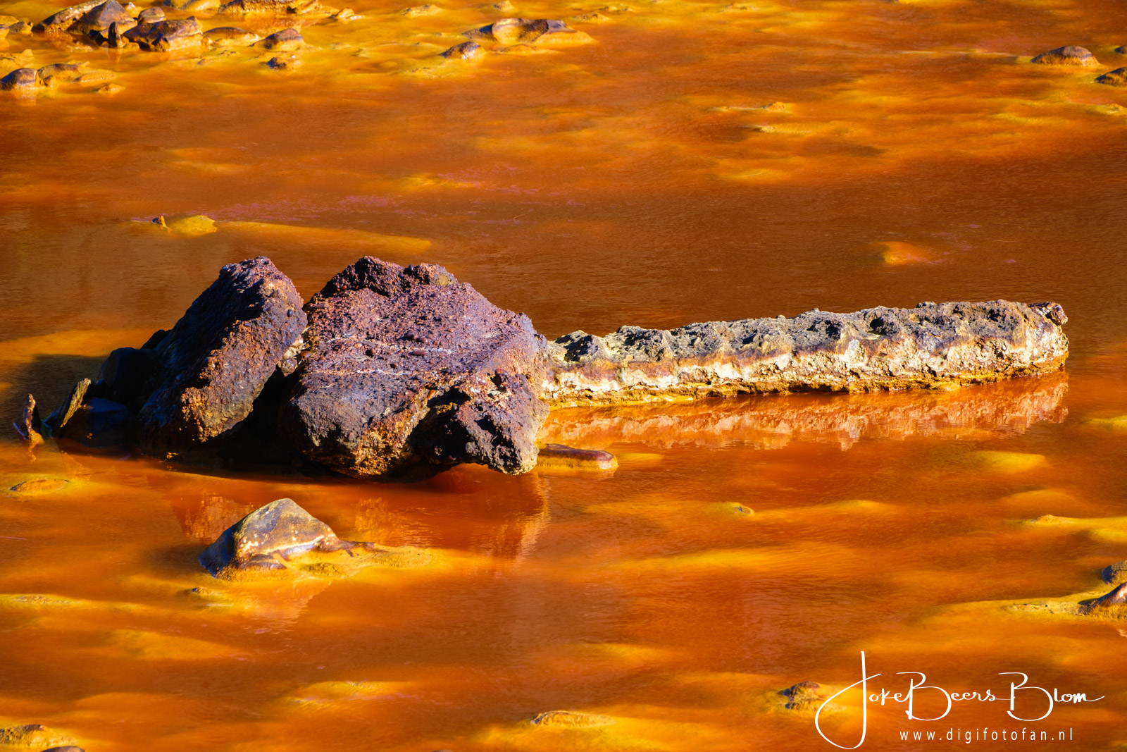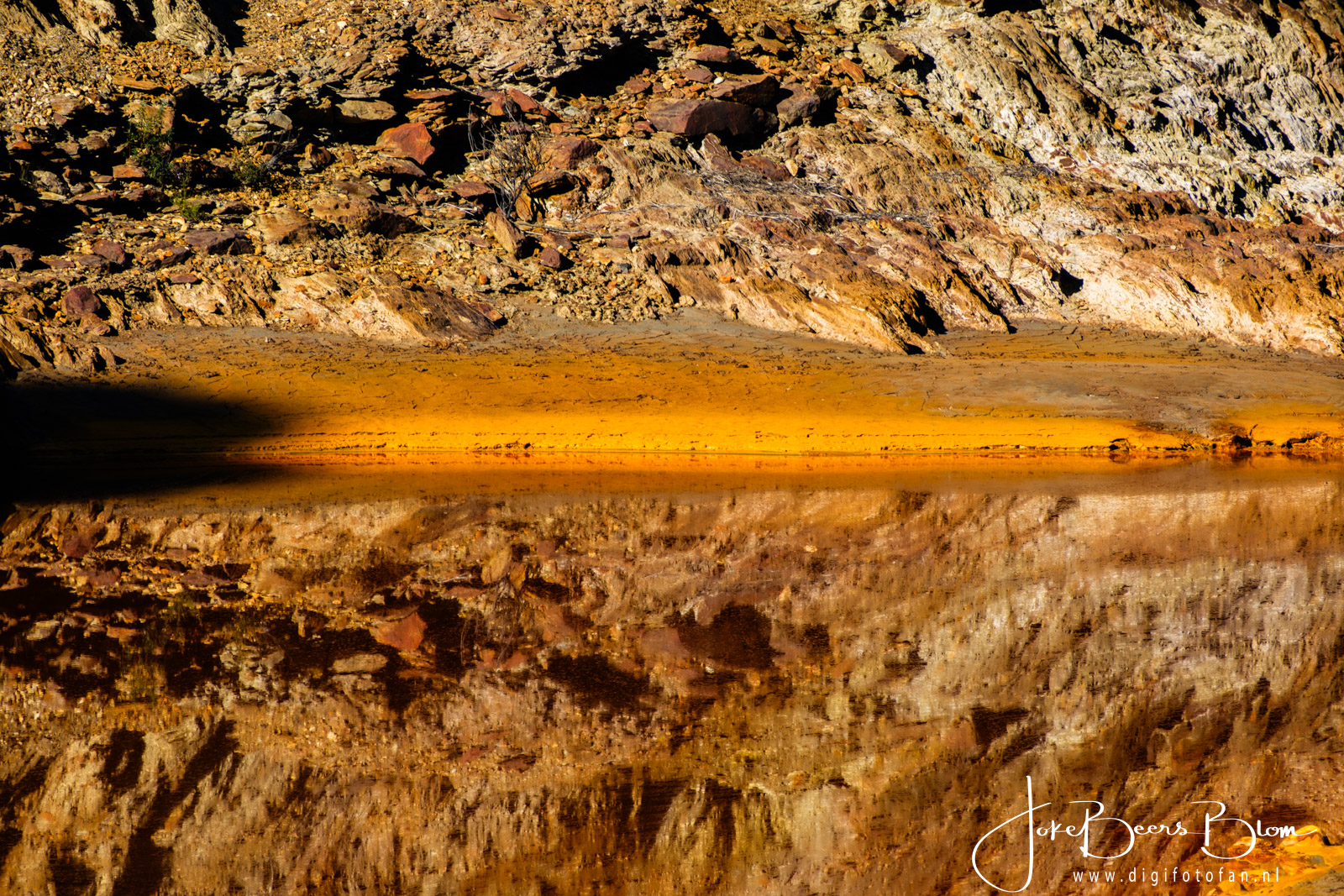 We hebben in januari de Rio Tinto weer bezocht, twee jaar geleden waren we op dezelfde plakken maar toen was het druilerig, grijs, miezerig weer. Nu was het stralend zonnig en knalden de kleuren en patronen er nog meer uit. Ik heb eerder al een blogpost met info over de Rio Tinto geschreven (klik). Ik ben het daar echter niet met mezelf eens over de conclusie dat de kleuren met regen en bewolking mooier zouden zijn. Feit is wel dat het in de morgen bij Berrocal het mooiste is, als de zon er meer boven staan zijn de kleuren inderdaad wat minder mooi. Twee jaar geleden zijn we daar later namelijk nog een keer terug gegaan toen het zonnig was en dat was in de middag en de kleuren waren toen minder mooi. Dat was ook in januari dus in dezelfde periode. Ik denk dat je in de zomer vroeg in de morgen moet zijn om het mooiste licht te vangen. Hoe dan ook het was nu prachtig, de kleuren spatten er werkelijk vanaf, de patronen zijn ook waanzinnig mooi en omdat het nu windstil was, was de weerspiegeling ook prachtig.