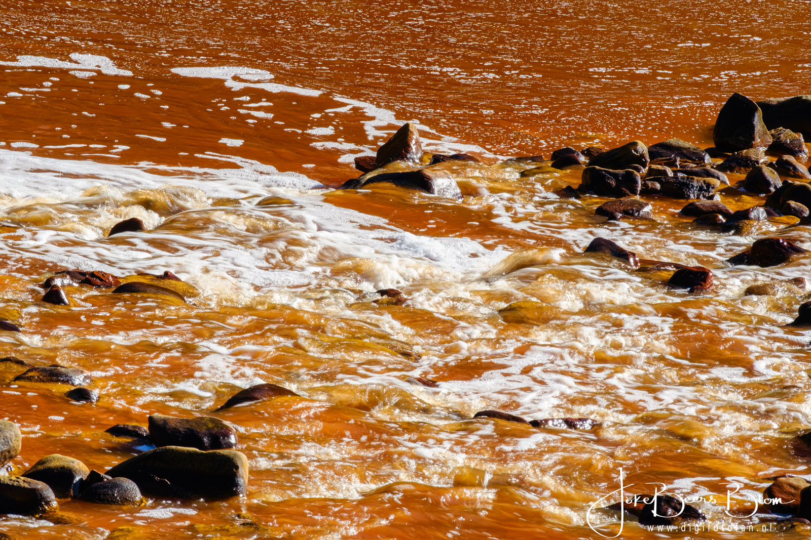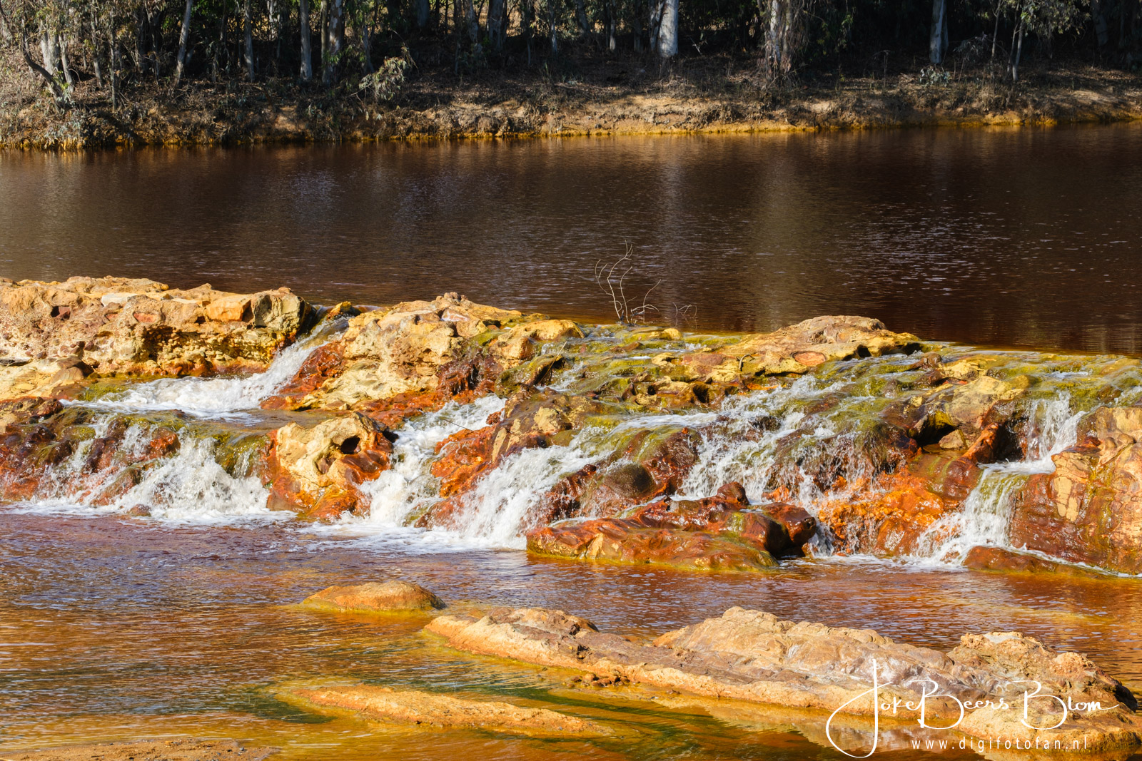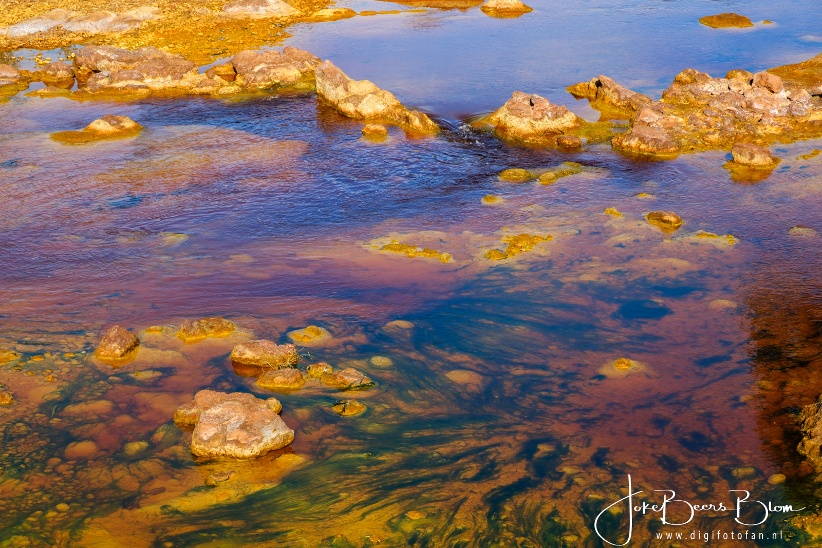We zijn op drie plekken bij de Rio Tinto geweest, wat patronen e.d. betreft vind ik het bij Berrocal het allermooiste, je kunt er ook prima parkeren en je langs de kant en op de brug heerlijk uitleven op alle kleuren en patronen. Overigens de omgeving van Berrocal, een klein dorp, is ook fantastisch mooi. De volgende stop was bij Puente Gadea en ook daar kun je prima parkeren, ruimte genoeg. Hier is ook een stroomversnelling en dat is wel mooi met die kleuren, de omgeving daar is ook prachtig evenals de route er naartoe. Hier zitten ook heel veel ooievaars, ook leuk 🙂 De derde plek waar je makkelijk bij de rivier kunt komen in bij Niebla, parkeren bij een tankstation en de weg oversteken naar de brug maar ook daar kun je naar beneden wandelen en heel dicht bij de rivier komen. Stap niet in de rivier want het water is niet gezond met al die metalen erin. De kleur komt overigens mede door alle mineralen die daar in de grond zitten. Het gesteente is ook prachtig, heel erg kleurrijk. Mocht je ooit die kant op willen, ik kan je de coördinaten van de plekken geven.