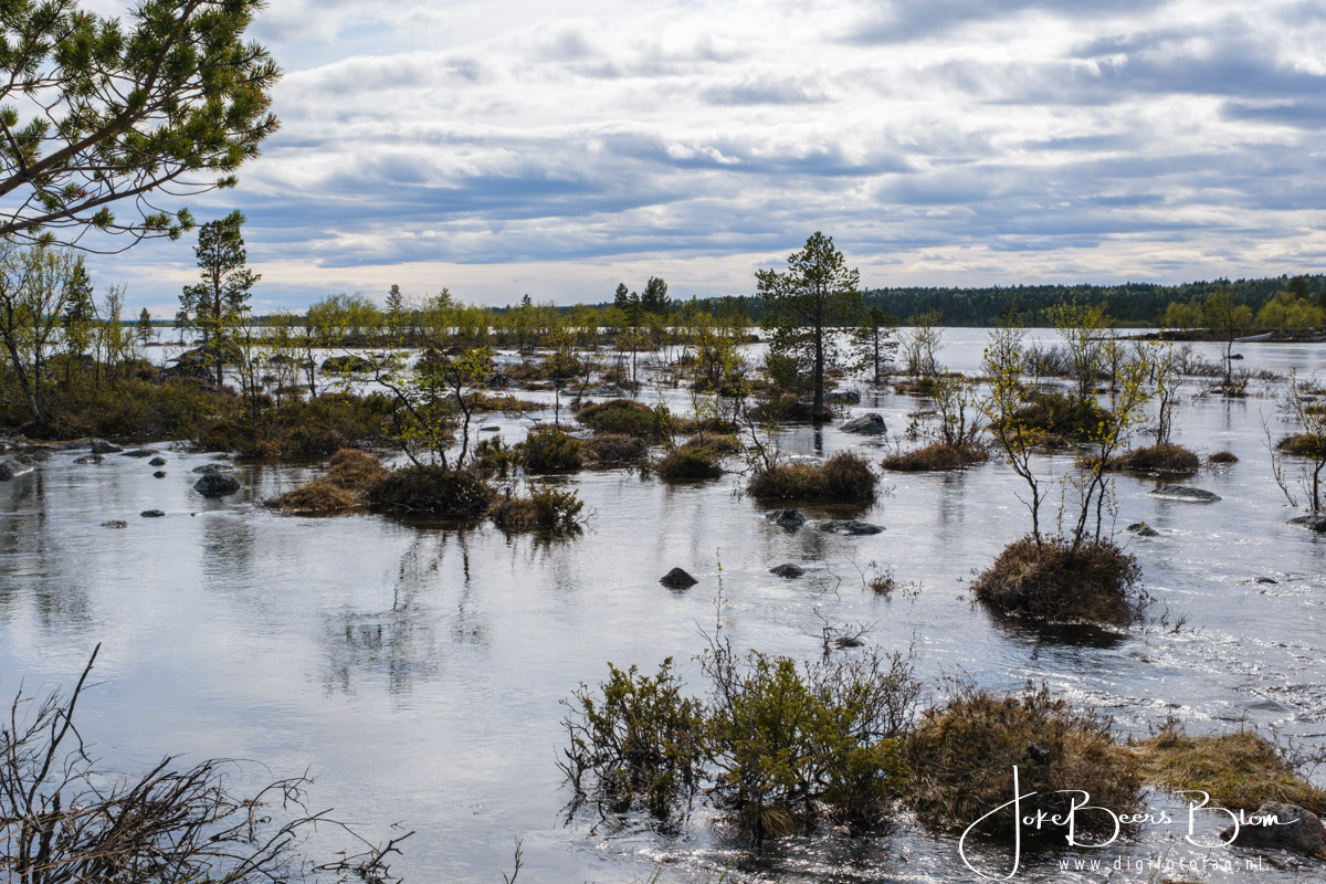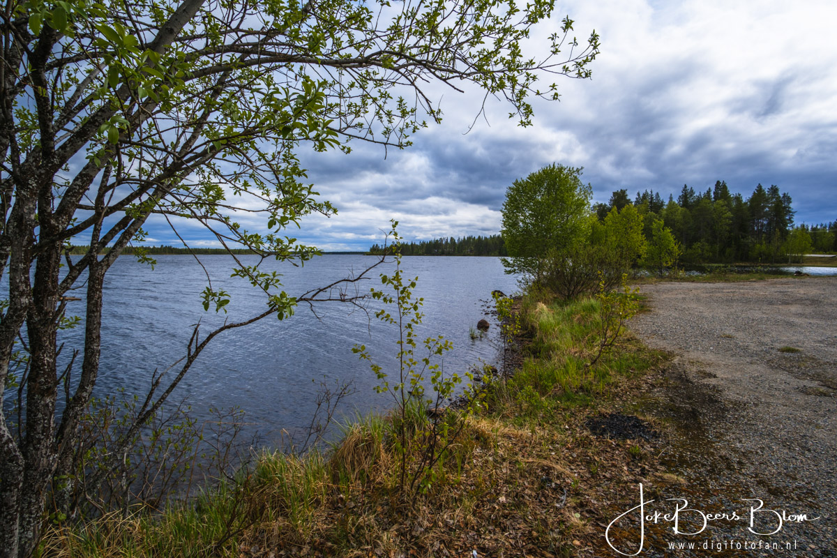 Inmiddels waren we in het noorden van Zweden aangeland waar we op de eerste dag van de meteorologische zomer in sneeuw- en hagelbuien reden! Op zich waren we wel blij dat het nog behoorlijk fris was want dan heb je nog geen last van alle muggen in het noorden, die worden knap vervelend als het warmer wordt, meer dan eens ben ik daar totaal lek gestoken! Maar sneeuw en hagel hoefde nou ook weer niet 😉 Na boodschappen gedaan te hebben eindigden op een prachtige plek waar we vier jaar geleden ook overnacht hebben, aan het Hirvijärvi en zowaar vlak voor zonsondergang kwam de zon erdoor en bezorgde ons een prachtig kleurenspel, het waaide en het was erg koud maar zo mooi! Het was rond het vriespunt die avond en nacht. De zon ging hier nog onder, daarna voor ons een tijdje niet meer, de middernachtszon deed zijn intrede en dat blijft prachtig! De overnachtingsplek was vlakbij de grens met Finland en zo zijn we via Rovaniemi noordwaarts gegaan, het drukke kerstmannendorp hebben we links laten liggen, dat is een grote kermis en heel erg druk!