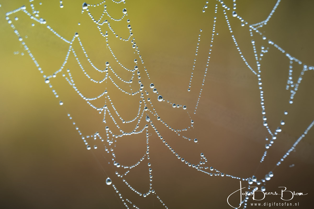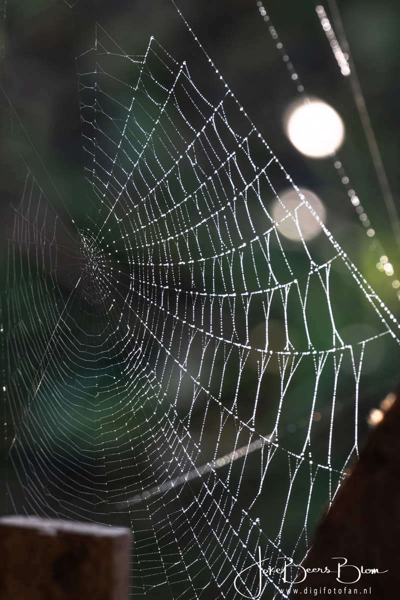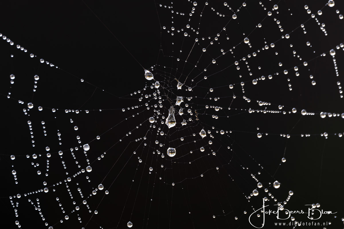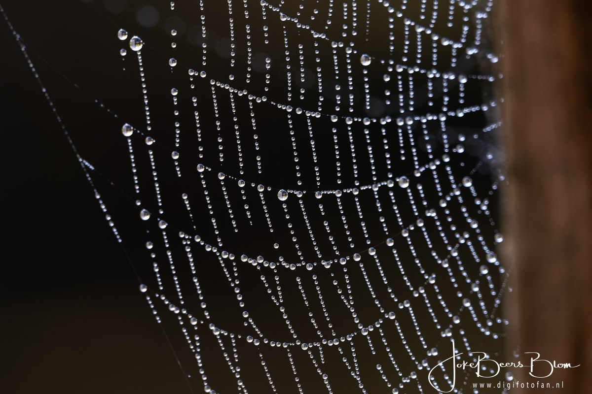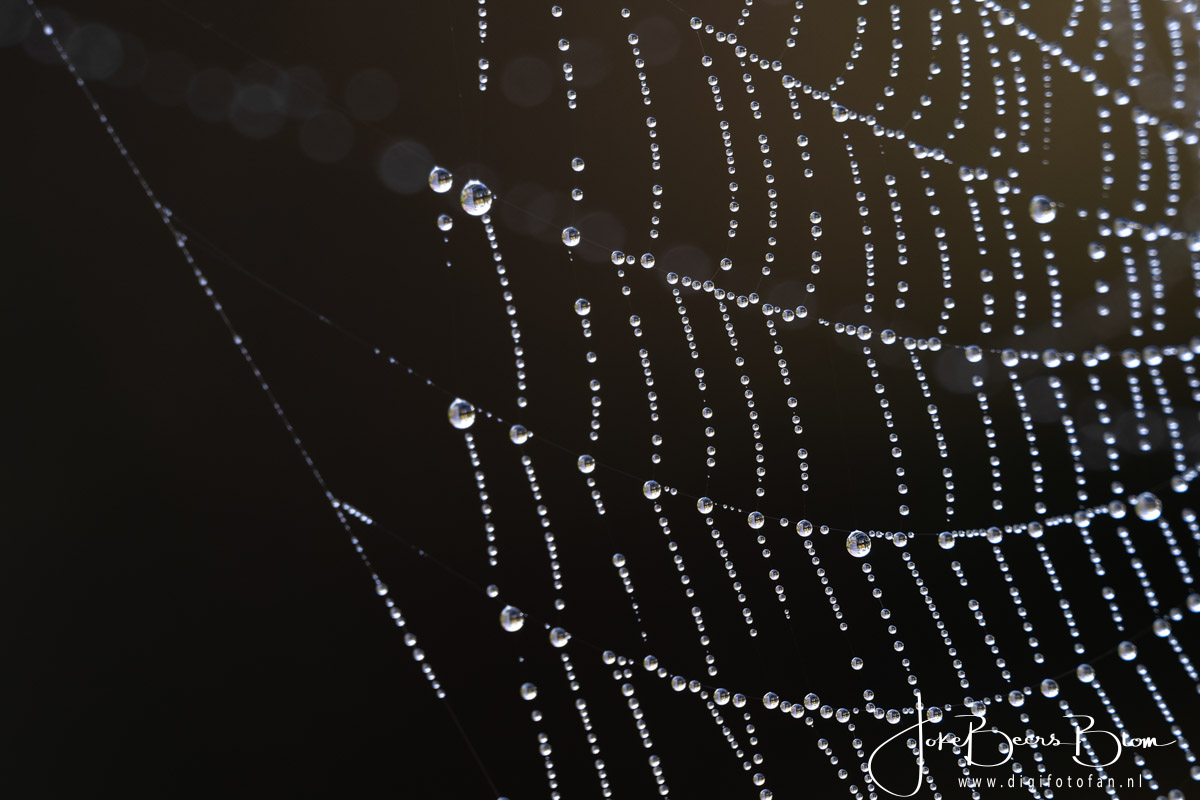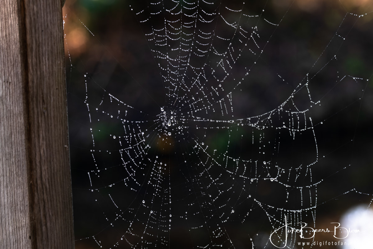 Vorige week was het regelmatig ’s morgens mistig en dat levert vaak prachtig spinnenwebben vol met druppeltjes op. En bij ons achter de schuur hebben we meer dan voldoende spinnenwebben 🙂 En dan kan ik het niet laten de camera te pakken en wat foto’s te maken. Deze keer met de 150-600 mm omdat die al op de camera zat. Omdat de spinnenwebben overal zaten hebben we dus ook verschillende achtergronden, donker of de struiken aan de andere kant van de sloot wat weer een prachtige bokeh oplevert. Kortom even lekker gespeeld 🙂