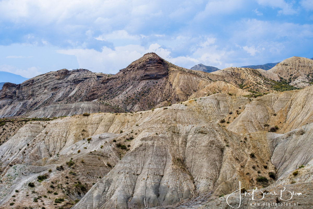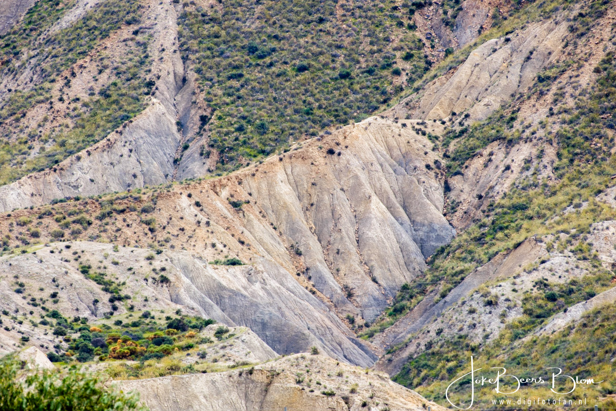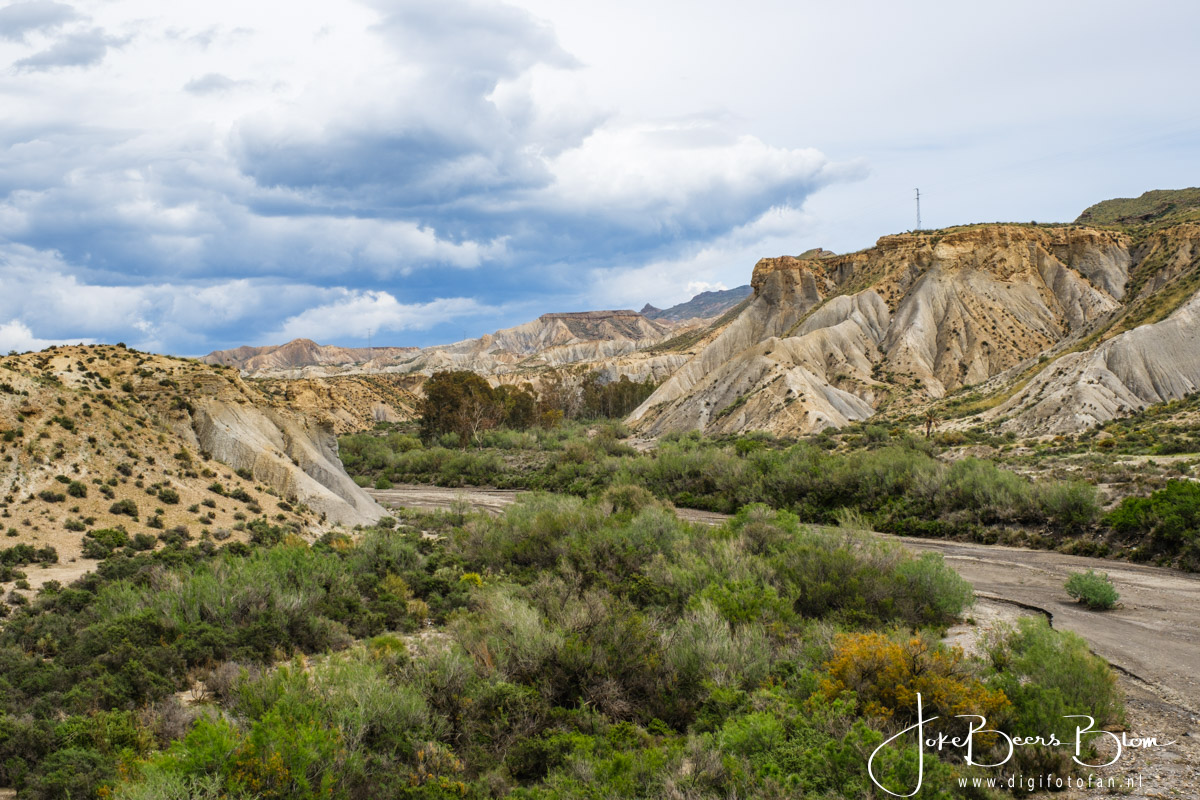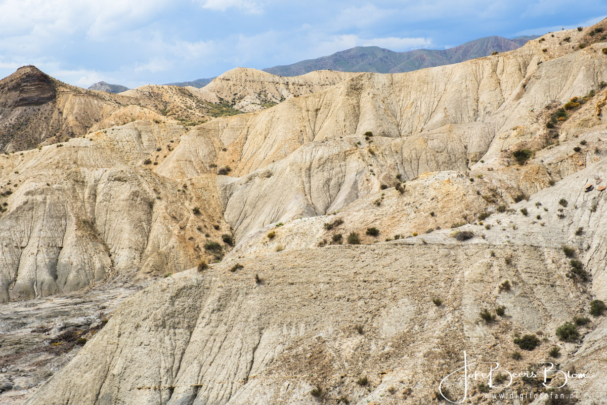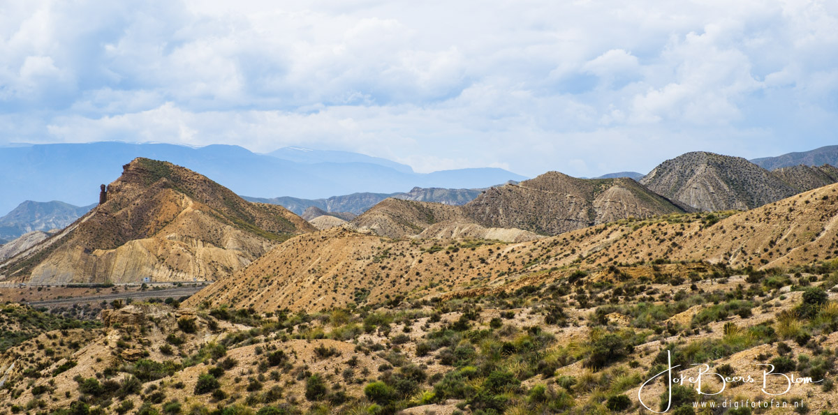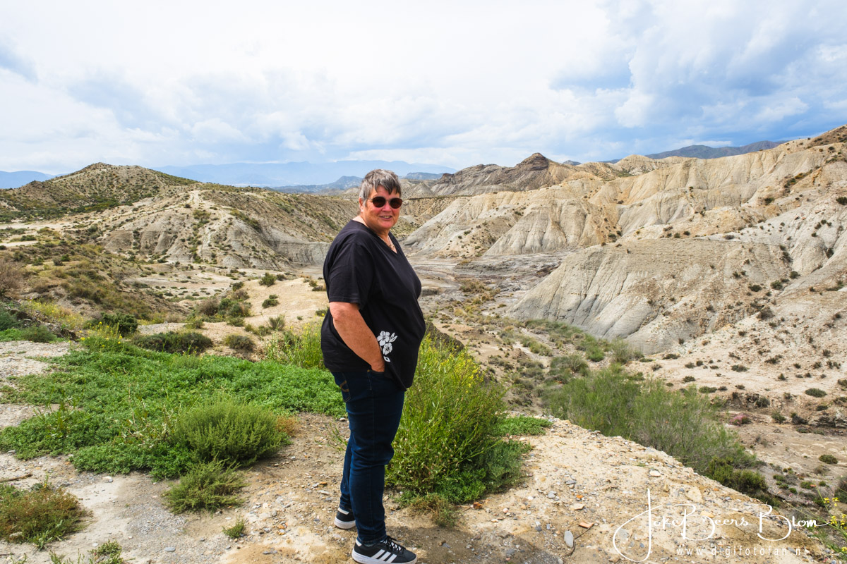 Omdat het weer in Spanje in april niet het weer in Nederland was, jawel heel bijzonder maar het was wel zo, zijn we zuidelijker afgezakt dan oorspronkelijk de bedoeling was. Daar was het warmer en droger en zeker in dit gebied kun je rekenen op mooi, droog weer. We zijn hier eerder doorheen gereden maar de plekken waar we nu gestopt zijn hebben we toen deels op een of andere manier over het hoofd gezien. Het is zo’n prachtig gebied, de vormen van de rotsformaties zijn echt waanzinnig mooi. Je kunt er op een paar plekken in en alleen te voet en dat zijn geen makkelijke wandelingen dus helaas niet bepaald geschikt voor mij. Maar op diverse plekken kun je ook zonder moeilijke wandelingen enorm genieten van het gebied en dat hebben we gedaan, deze keer veel uitgebreider dan de vorige keer, het was echt genieten. Het is het droogste gebied van Europa, de regen blijft tegen de bergen aan hangen en dat hebben we ook zelf meegemaakt, tijdens de klim op de bergrug die de regen in de woestijn feitelijk tegenhoudt kwam de regen letterlijk met bakken uit de lucht, toen we over de top waren zagen we nog wel de zwarte wolken maar werd het droog en bleef het droog.