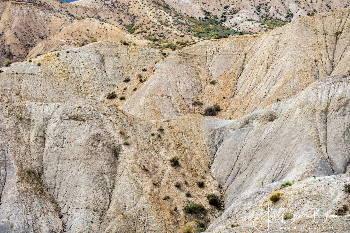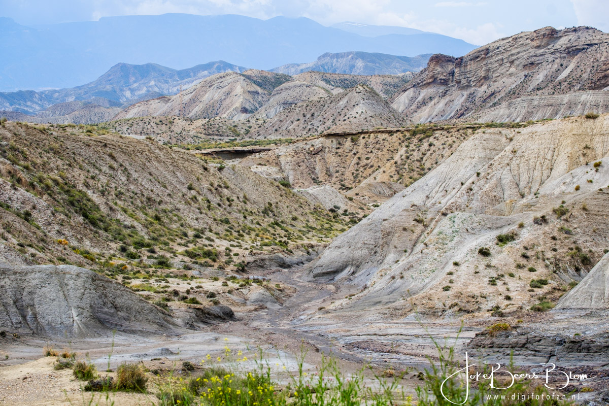 Kenmerkend voor de Tabernas woestijn is een landschap dat is ontstaan vanuit een proces van natuurlijke woestijnvorming, waar je diepe ravijnen gaat vinden die vaak zijn uitgesleten door de zeldzame en soms verwoestende regens die hier ieder jaar slechts een paar dagen per jaar voorkomen. Noodweer zoals dat alleen in droge gebieden kan ontstaan. Een klimaat waarin je als mens liever niet je stulpje wil bouwen maar waar struiken en palmbomen klaarblijkelijk kunnen overleven.
