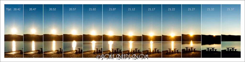 Deze is gemaakt op een wereldplekje aan een meer waar we op de rotsen stonden en waar we dus ook overnacht hebben. De camera stond op een tafeltje maar dat heeft toch nog een keer ietsjes bewogen maar gelukkig niet al te hinderlijk. In Photoshop heb ik de foto’s bijgesneden, lange leve de handelingen en batch verwerking, anders krijg je ze nooit gelijk en duurt het ook een tijd, het zijn 120 foto’s. Ondanks lichtvlekken, ergens maken die het wat levendiger vind ik, is het een grappig resultaat geworden volgens mij.