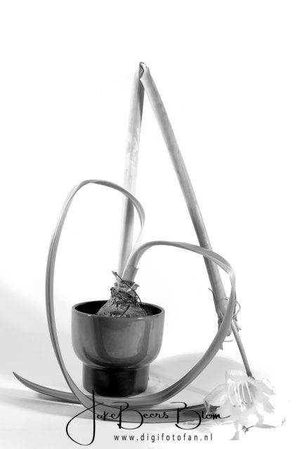 Mijn project op de fotoclub is vergane glorie, dat kan van alles zijn, van roestige scheepswrakken tot uitgebloeide planten. Voor ons project dat een seizoen lang loopt leveren we elke clubavond twee foto’s in. Deze keer heb ik mijn uitgebloeide amaryllis die ook veel te hoog geworden was (het ding werd aan alle kanten gestut) vereeuwigd voordat deze in de groene afvalemmer zou belanden. Voor de club heb ik de zwart-wit versies aangeleverd omdat ik die het mooiste vond, zeker van de plant in de pot. Van de bloem vond ik eigenlijk beide versies wel mooi, hoe iets dat uitgebloeid is en weggegooid wordt nog zo fotogeniek kan zijn! Door op de foto’s te klikken kun je ze veel groter bekijken.